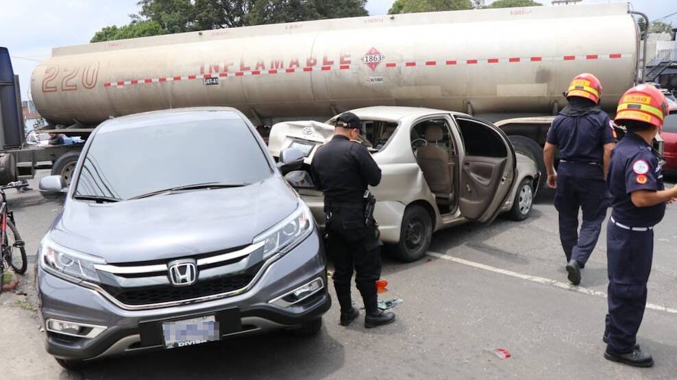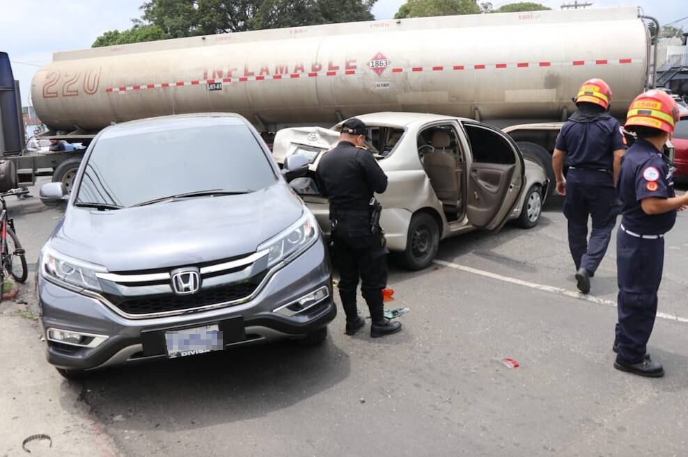 Los Bomberos Municipales atendieron a seis personas lesionadas, entre ellas tres menores de edad, quienes iban en dos vehículos que fueron colisionados por un tráiler en la 2ª. Avenida, 4-09, en la zona 2, en el anillo Periférico, a inmediaciones del ingreso de la finca El Zapote.