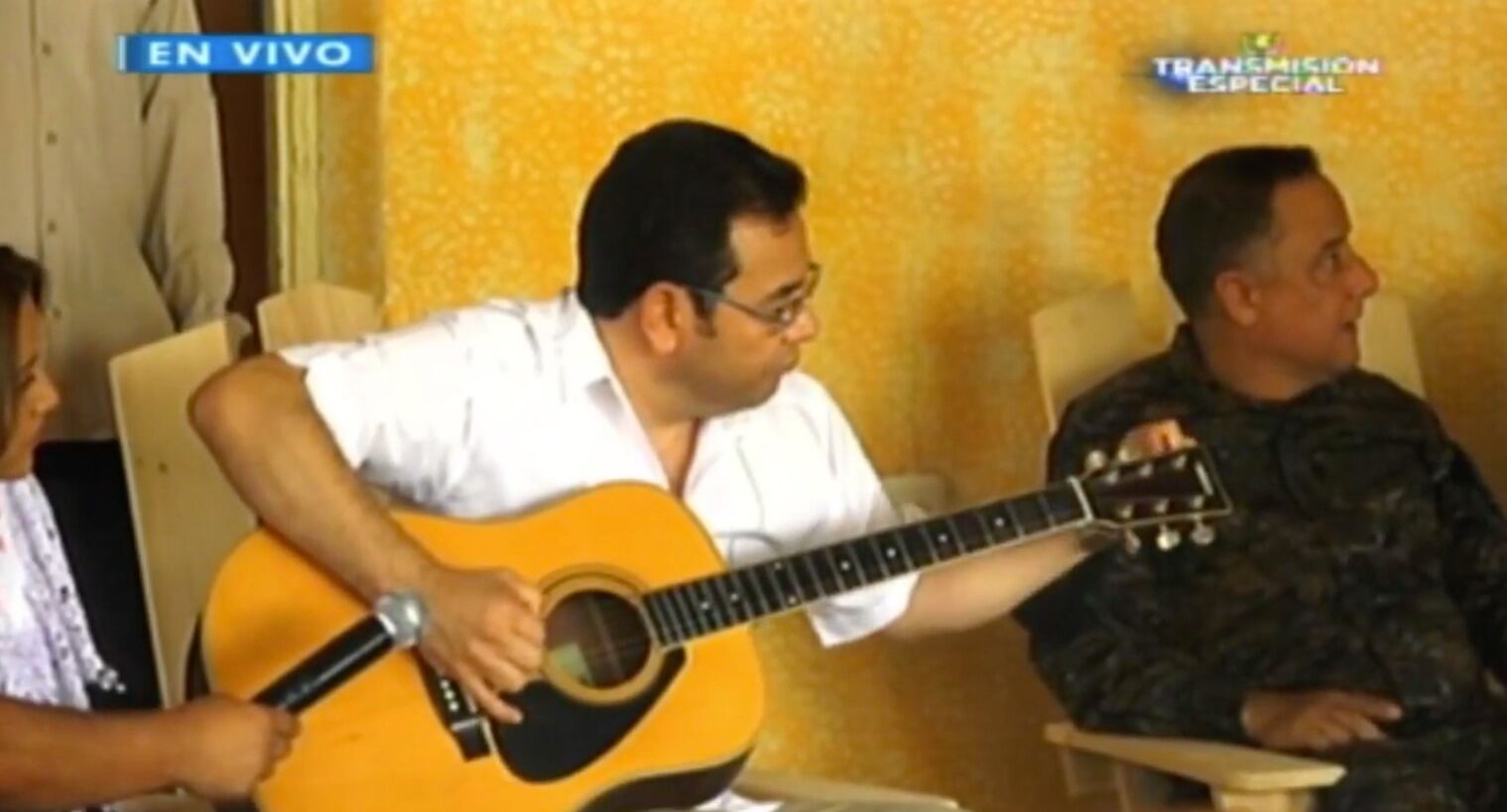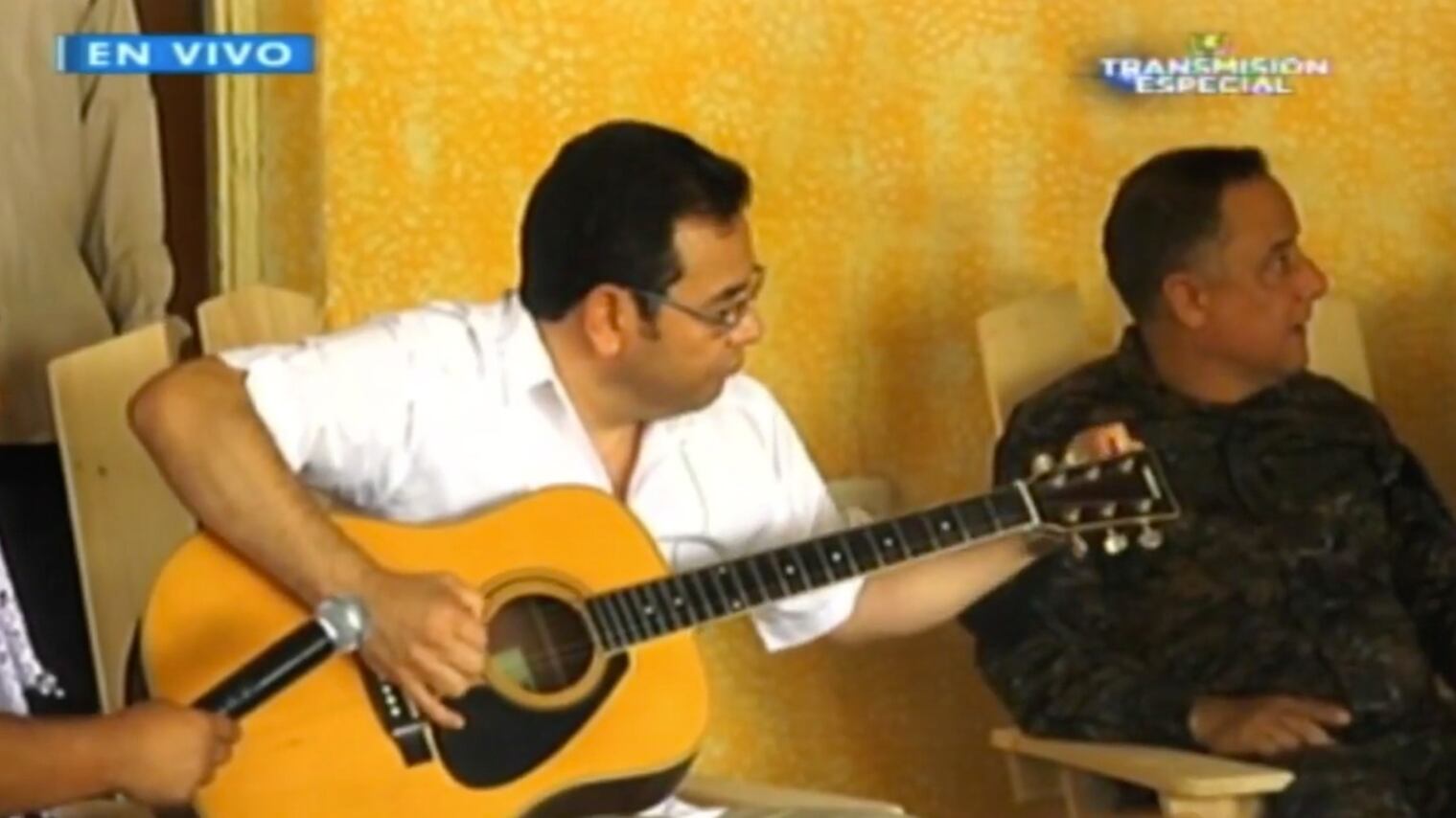El mandatario demoró algunos minutos en afinar la guitarra y tras escuchar las solicitudes de los abuelitos decidió cantar el tema "La Barca de Oro".