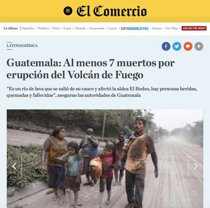 “El Comercio”, “Guatemala: Al menos 7 muertos por erupción del Volcán de Fuego”. “Es un río de lava que se salió de su cauce y afectó la aldea El Rodeo, hay personas heridas, quemadas y fallecidas”.