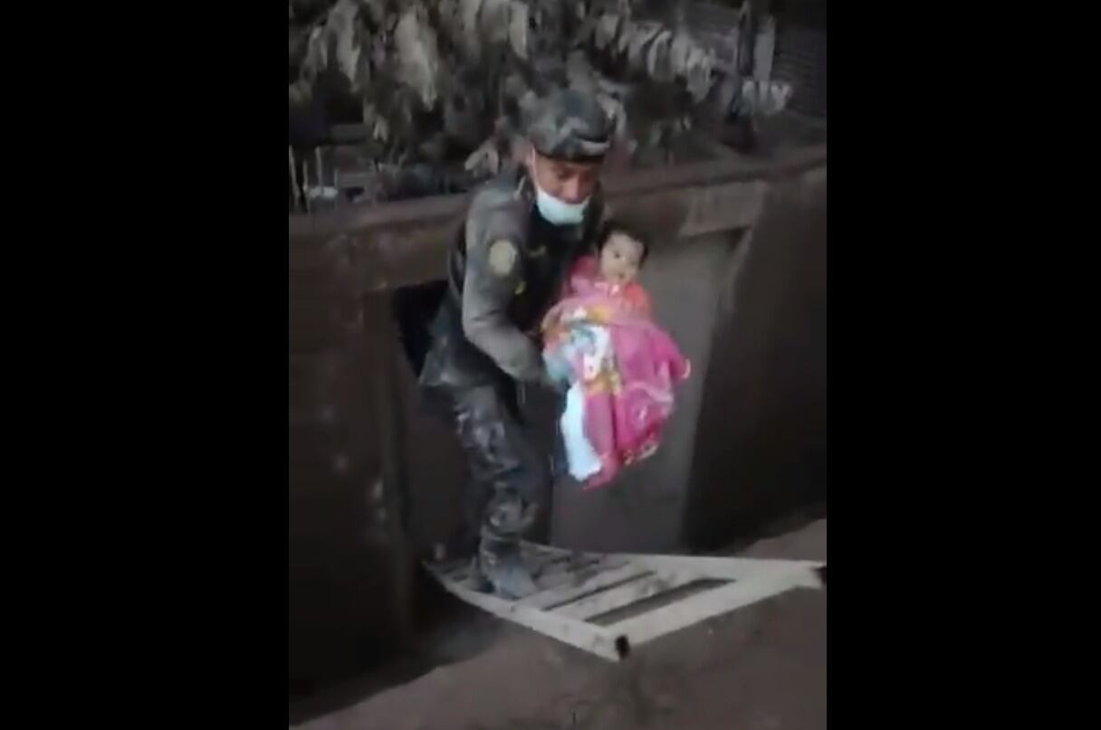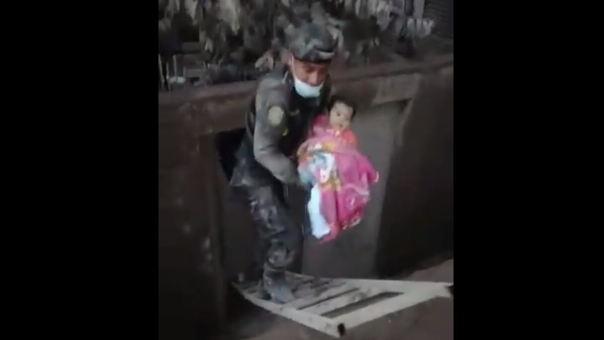 "De esta manera, nuestros valientes elementos de la Policía Nacional Civil rescatan a una bebé, luego que el volcán de Fuego hiciera erupción" escribió la cuenta @PNCdeGuatemala. La publicación estaba acompañada del hashtag "#PNCProtegerYServir".