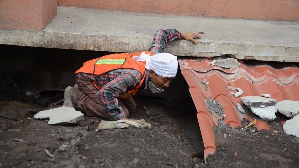 “Bones”, quien se dedica a la albañilería, ha apoyado a los vecinos desde que se permitió el ingreso de socorristas y voluntarios para la búsqueda y rescate de los cuerpos. Su equipo consiste en guantes y una mascarilla que los cuerpos de socorro le han proporcionado. Él se amarra una camiseta en la cabeza y continúa con el apoyo a las víctimas.