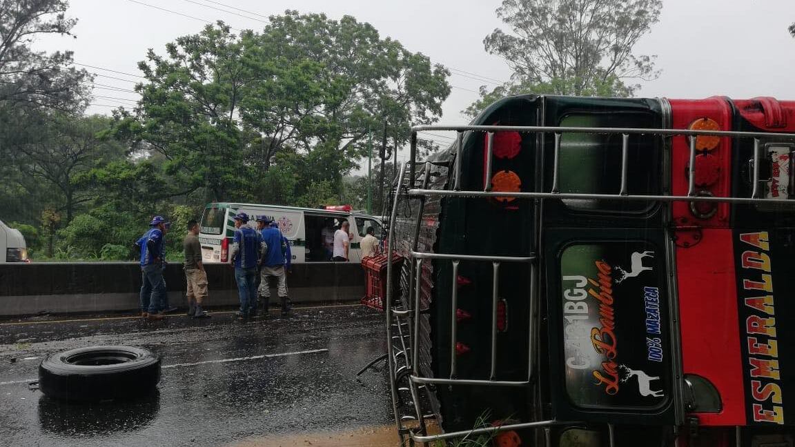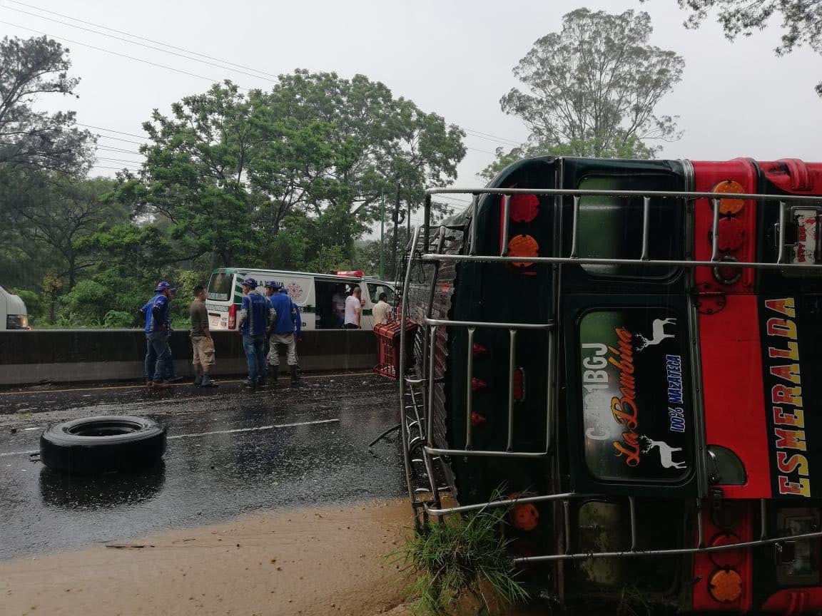 Un autobús extraurbano con ruta a la Costa Sur volcó en el kilómetro 25.5 de la ruta al Pacífico. Se informó que el piloto huyó del lugar.