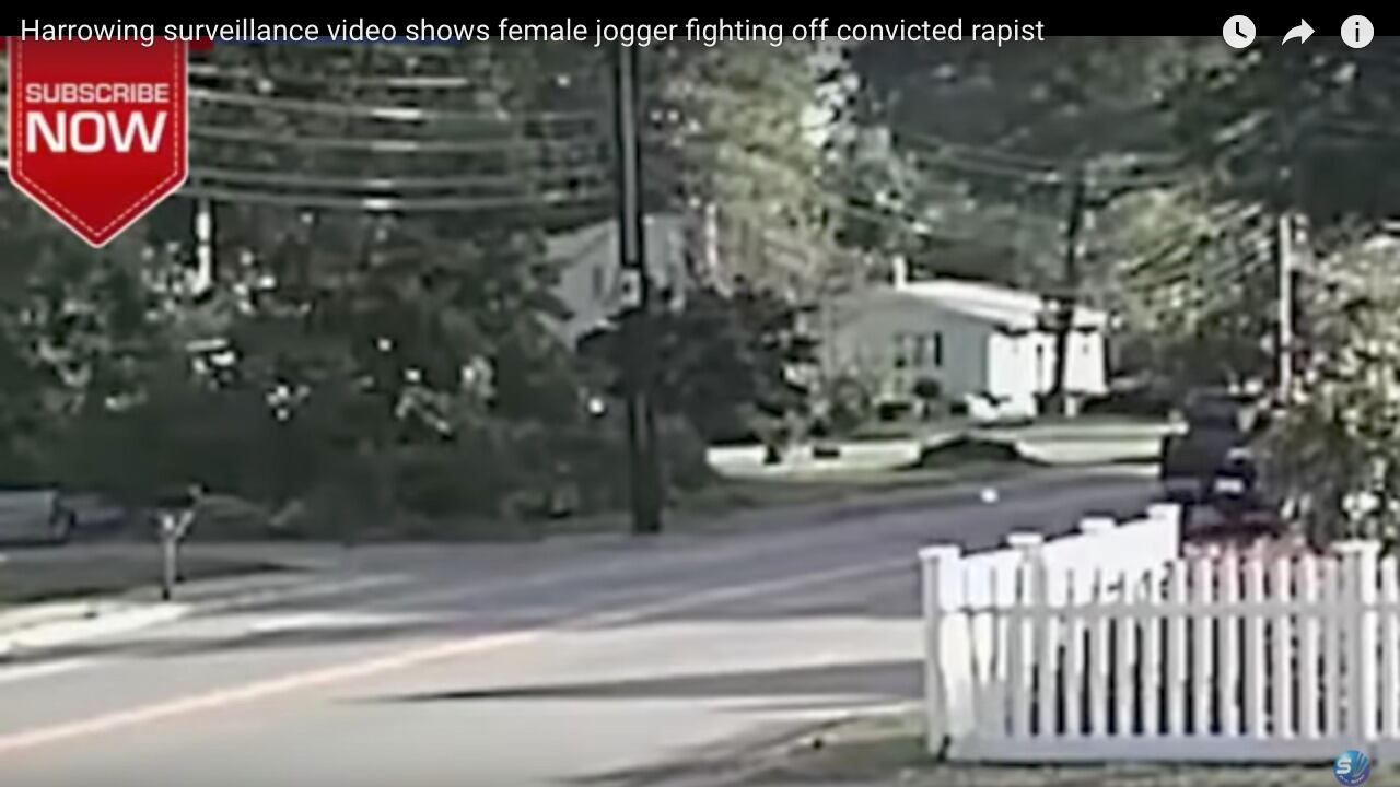Las imágenes muestran como la víctima trota por la calle, cuando un coche se detiene frente a ella y del vehículo desciende el atacante, quién la persigue hasta unos arbustos.
