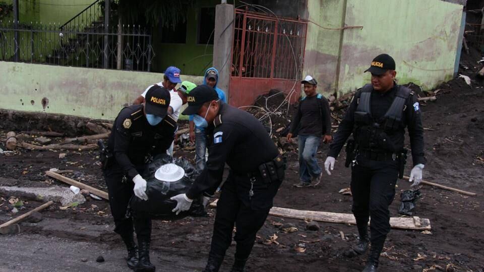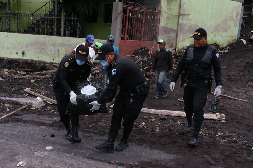 Agentes de la Policía Nacional Civil (PNC) de Escuintla apoyaron al traslado de los restos de al menos ocho víctimas más halladas en San Miguel Los Lotes, lugar que quedó sepultado el pasado 3 de junio, tras la explosión del volcán de Fuego.