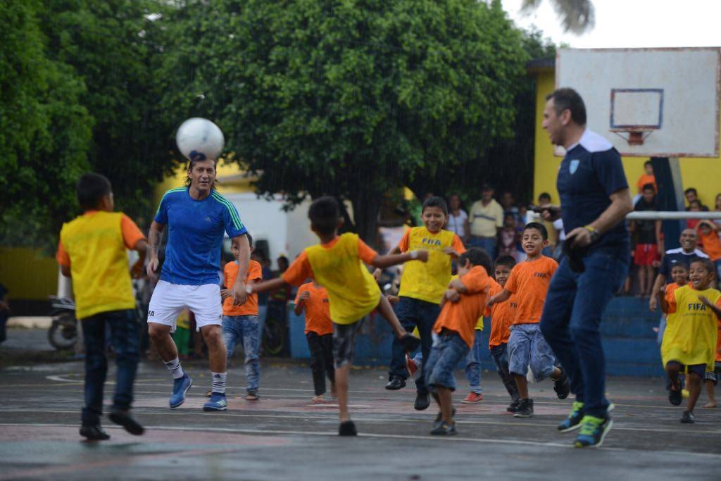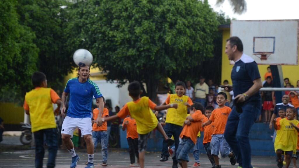 Sin importar la fuerte lluvia que se presentó este martes en Escuintla, el exfutbolista español y embajador de la FIFA, Miguel Ángel Salgado Fernández, mejor conocido como Míchel Salgado, compartió varios minutos con decenas de niños que se encuentran albergados en la Escuela Oficial Urbana Mixta Tipo Federación José Martí, en la zona 1 de Escuintla.