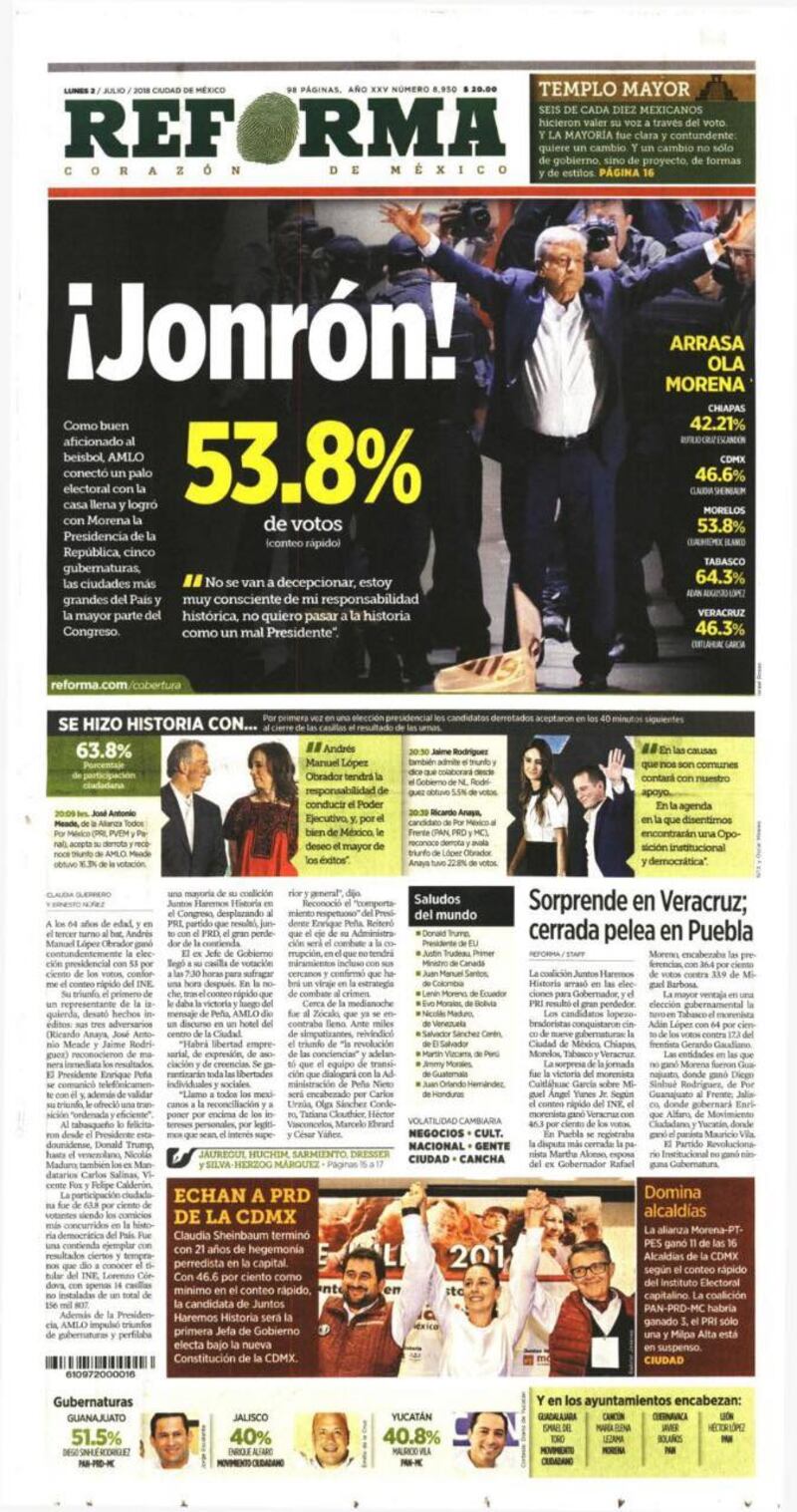 "AMLO derrumba al PRI, PAN y PRD", tituló el Economista en su portada. "Arrasa" escribió por su parte El Universal. Un título similar tuvo Excelsior, con su "Arrasó" y una foto de López Obrador levantando su mano derecha.