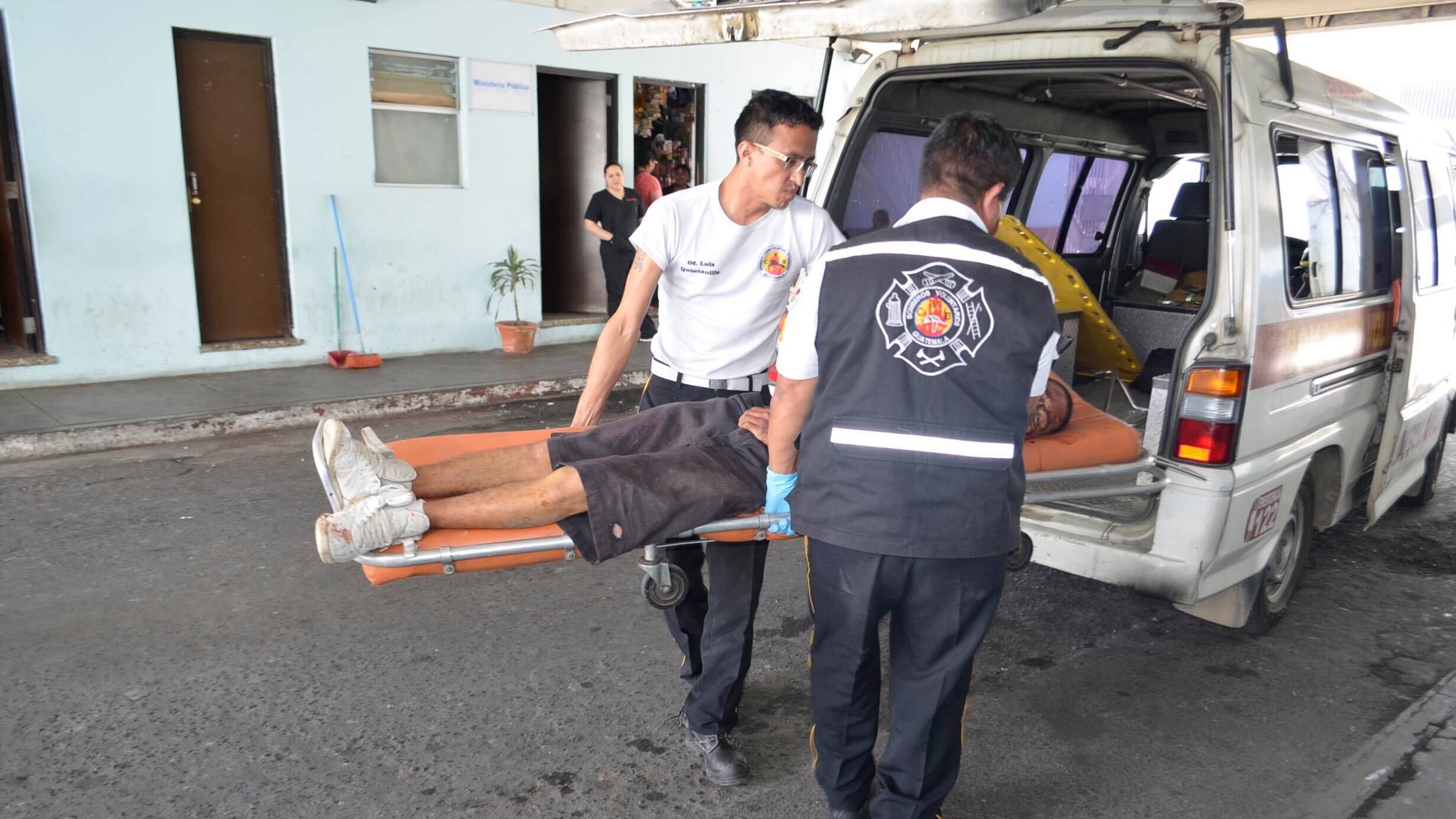 Personas que iban en un tuc tuc encontraron a un hombre que recibió varios impactos de bala en los campos de futbol de Las Brisas, en San Pedro Ayampuc, lo subieron al vehículo de alquiler y lo llevaron a la estación de los Bomberos Voluntarios, en San Luis.