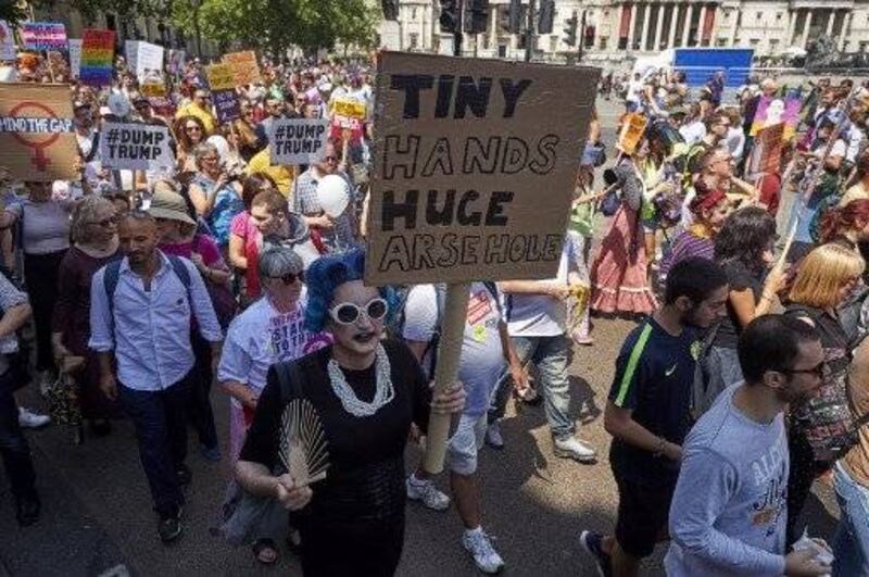 Un globo gigante que muestra a una versión caricaturizada de Donald Trump como un bebé llorón voló sobre decenas de miles de personas en Londres, que marcharon el viernes en protesta por la visita del mandatario estadounidense al Reino Unido.