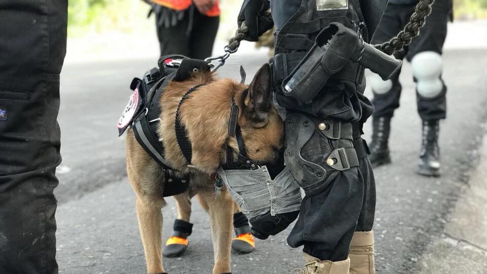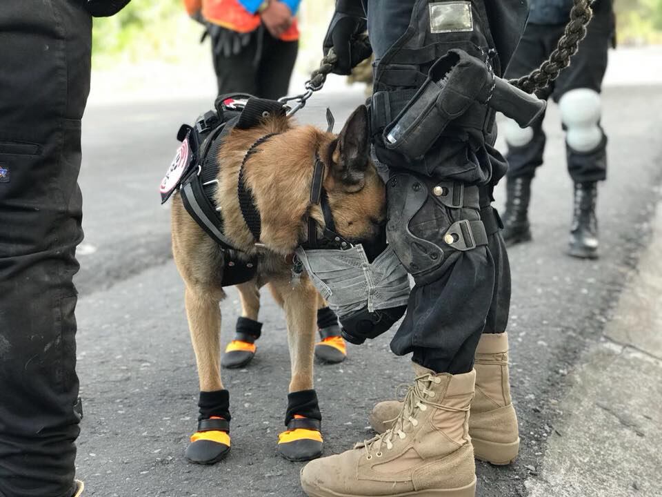 “Titán”, de dos años, pertenece a la Brigada Internacional de Rescate de México, quienes están apoyando como voluntarios en la búsqueda de víctimas.