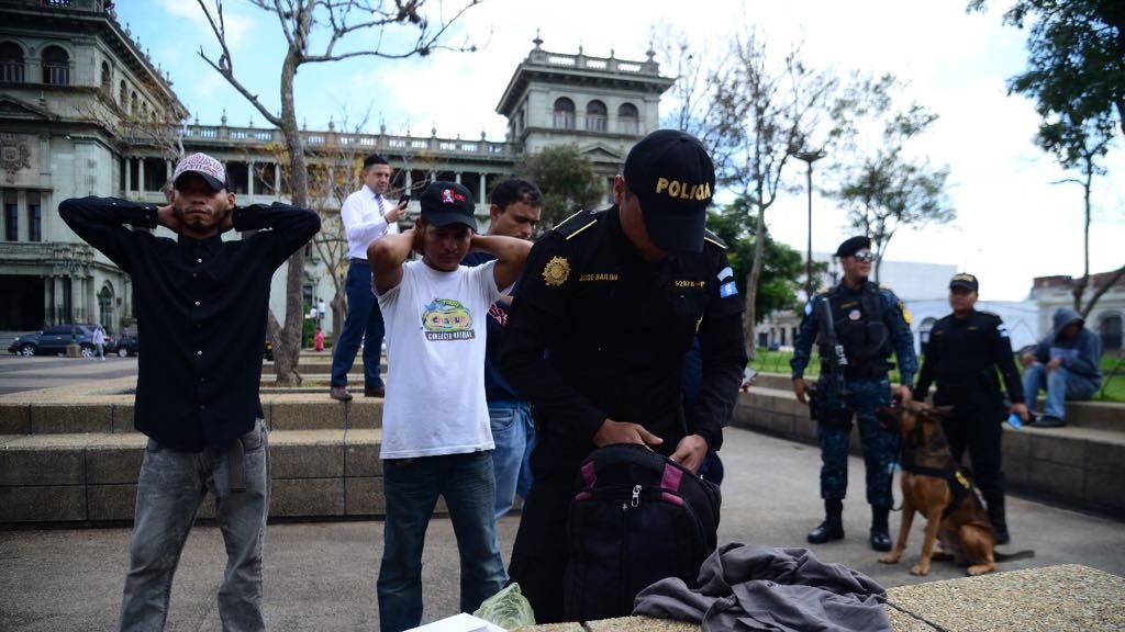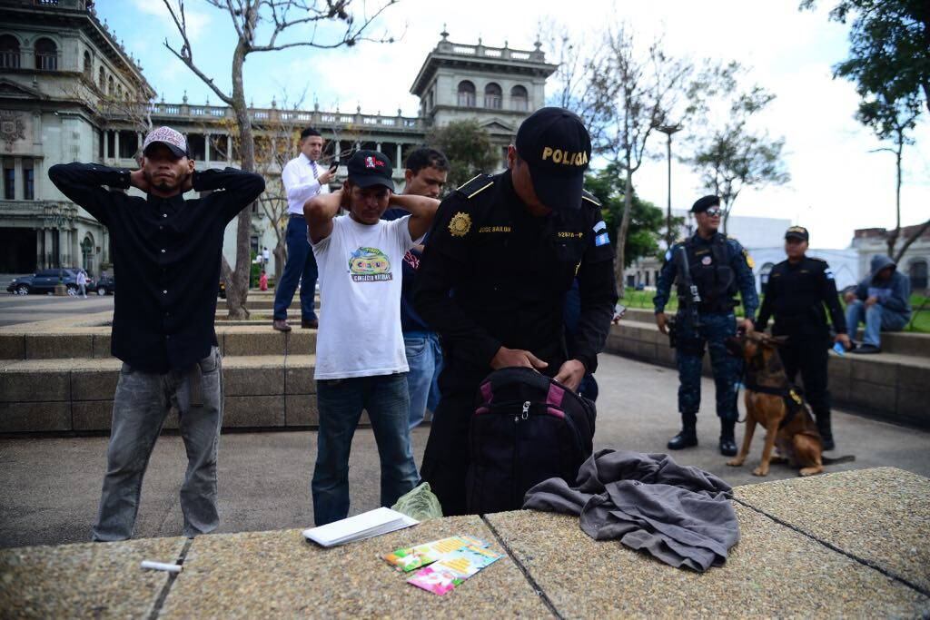 Agentes de la Comisaría 11 junto con las diferentes unidades especializadas de la PNC realizan las inspecciones en la zona 1 en contra del narcomenudeo, en lugares como el parque Colón, Plaza de la Constitución y Portal del Comercio.