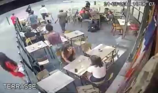 En el video se observa el enfrentamiento, posterior al golpe varias personas que estaban en la terraza del bar enfrentan al individuo. Momentos después el hombre se retira del lugar visiblemente molesto.