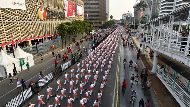 Perfectamente alineados, hombres y mujeres vestidos de rojo y blanco —como la bandera indonesia— bailaron en el centro de la capital a ritmo de "poco poco", una danza originaria de la región de Manado, en el norte de la isla de Célebes.