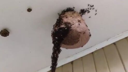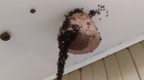 En el video se ve cómo miles de hormigas trabajan juntas para robar la miel de un panal que cuelga del techo en una vivienda en dicha localidad.