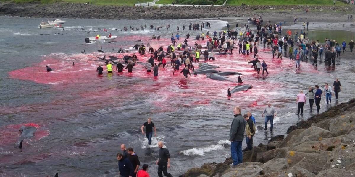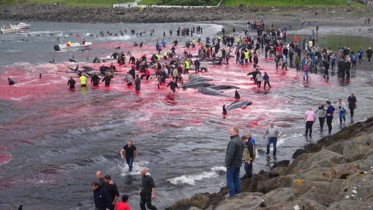 Una cacería de 180 cetáceos tiñó el mar de rojo sangre, en la bahía del Atlántico. Los espectadores contaron cómo los animales chillaron de terror después de que los pescadores los condujeran a la tierra firme antes de matarlos en las playas.