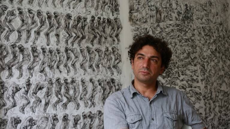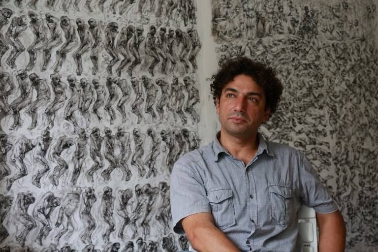 Cuerpos escuálidos y desfigurados por los golpes; miradas ojerosas; manos escondiendo los genitales… Colgados en las paredes de su departamento, estremecedores dibujos con tinta china muestran los abusos que Najah Albukai, un exprofesor de arte de 49 años vio y vivió mientras estuvo detenido en una prisión de Siria.