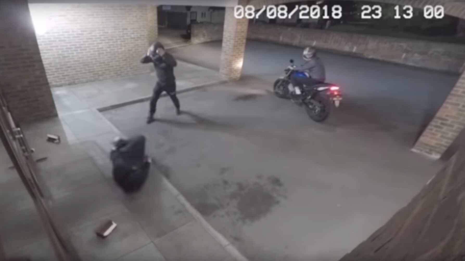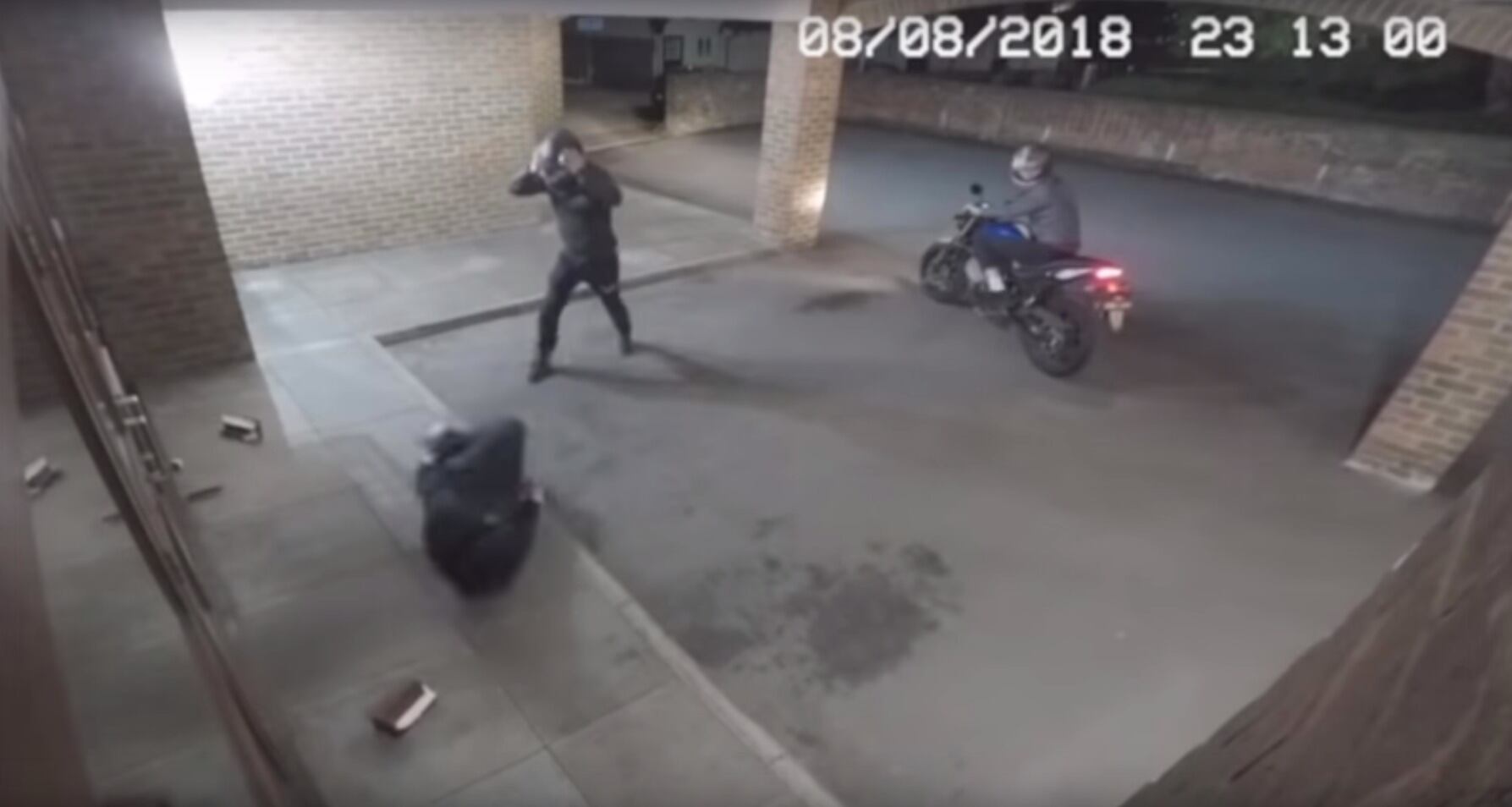 Desafortunadamente para él, en lugar de impactar la puerta, el ladrillo termina golpeando la cabeza de su colega, dejándolo inconsciente y tirado en el pavimento.