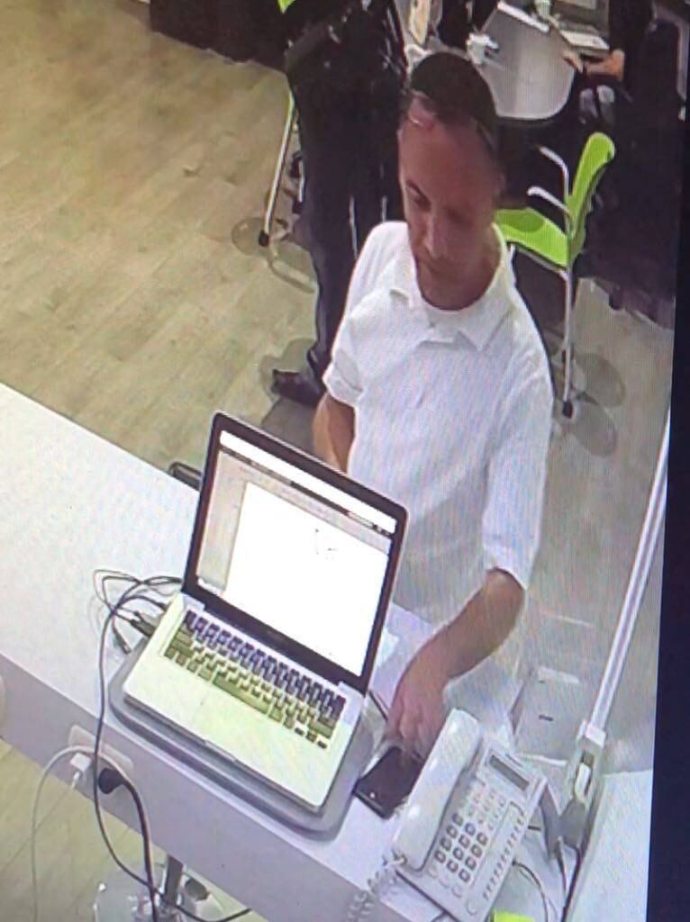 Los dueños de una tienda de electrónicos buscan a un individuo que se robó un costoso teléfono a plena luz del día.