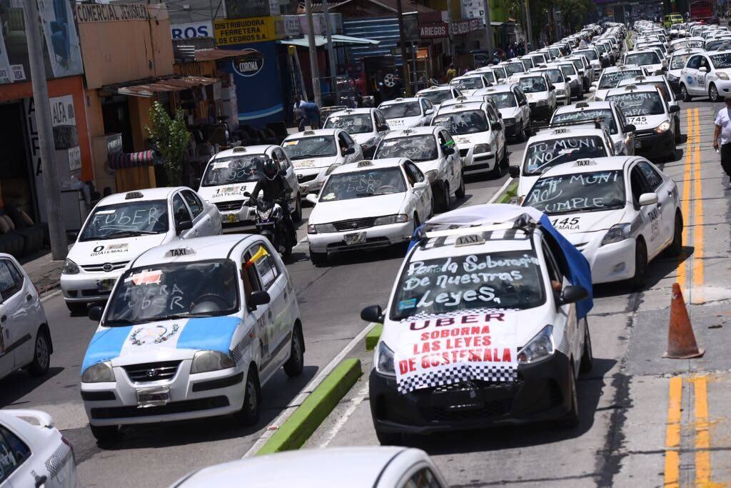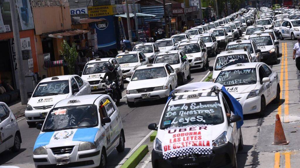 Propietarios y conductores de taxis llevan a cabo este lunes una manifestación en rechazo a las operaciones de Uber en Guatemala.