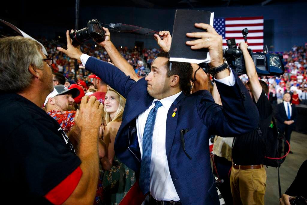 Un voluntario del equipo de avanzada en los actos públicos donde acude el presidente estadounidense Donald Trump bloqueó la cámara de un fotorreportero mientras trataba de fotografiar a un manifestante opositor en un evento de Trump en Indiana.