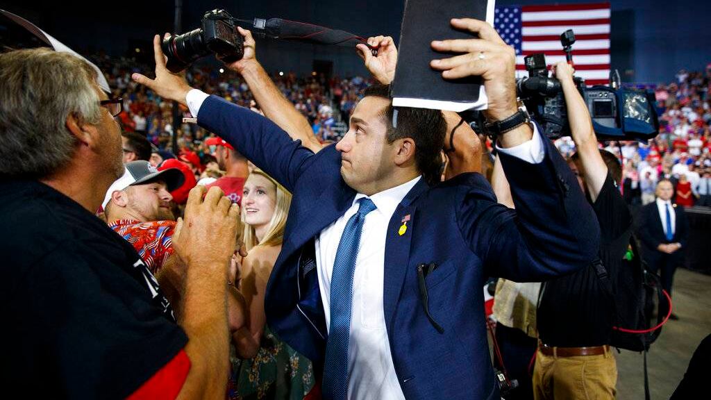 Una foto tomada el jueves por el fotógrafo de The Associated Press Evan Vucci en Evansville muestra al voluntario estirando el brazo para colocar la mano delante del lente de un fotógrafo, luego de que un manifestante interrumpió el acto.