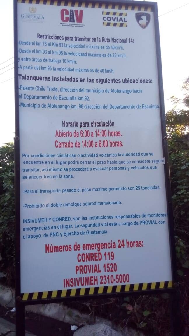 La Coordinadora Nacional para la Reducción de Desastres (Conred) anunció que el horario para circular por la Ruta Nacional 14, que conecta a Sacatepéquez con Escuintla ha sido modificado.