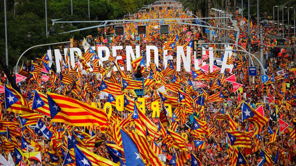 A continuación, se escucharon gritos de “independencia” y “libertad”, que recorrieron un tramo de seis kilómetros de la avenida Diagonal de la ciudad. En un gigantesco muro simbólico, los manifestantes derribaron la imagen de un rey de picas, en un aparente rechazo a la monarquía española.