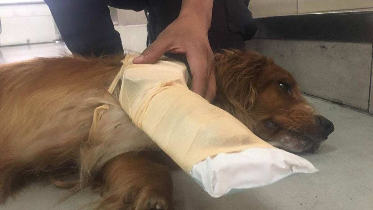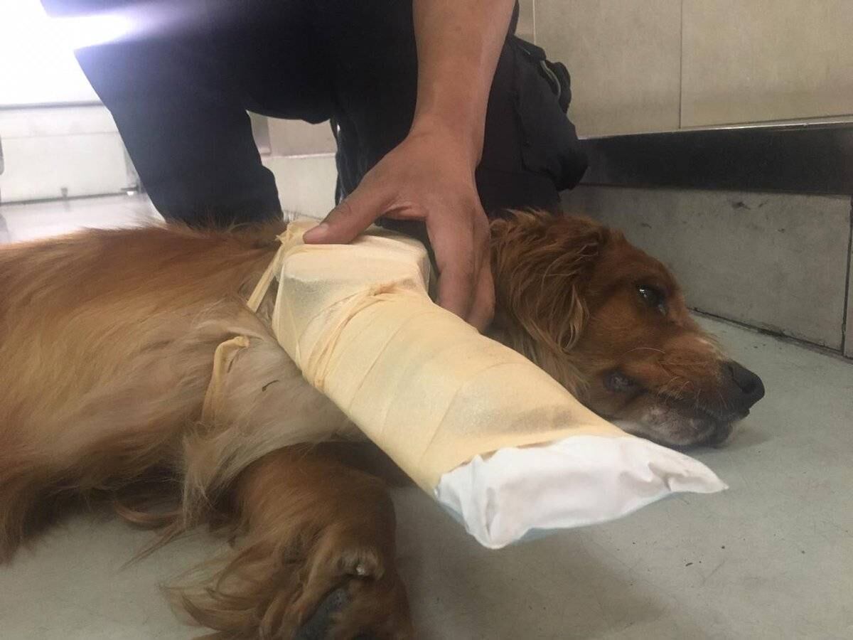 El can de color café quedó en manos de los socorristas municipales, quienes le curaron las heridas y fracturas. Y debido a que su pata derecha frontal fue la más lastimada durante el impacto, los bomberos le inmovilizaron con tablillas y vendas.