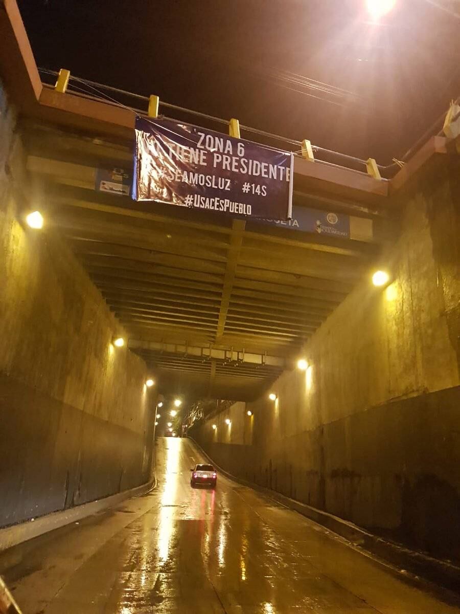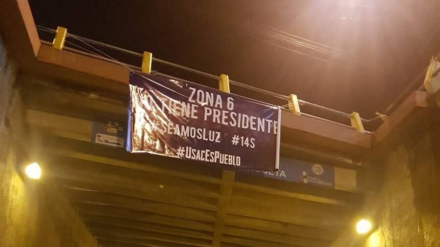 Este jueves se observaron las pancartas en paredes y pasarela, con textos que señalan que la zona 21, la Roosevelt, zona 6 y Mixco “no tienen presidente”. #SeamosLuz, #14S y #UsacEsPueblo se lee también en ellas.