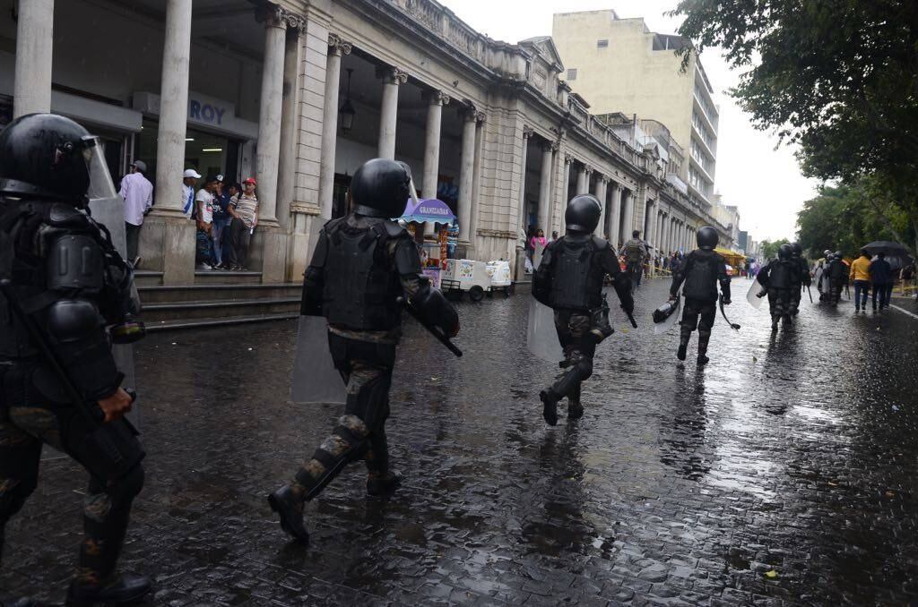 Un grupo de efectivos castrenses llegaron a la Plaza de la Constitución y, a causa de la lluvia, se resguardaron en el parqueo municipal que se ubica en el sótano.
