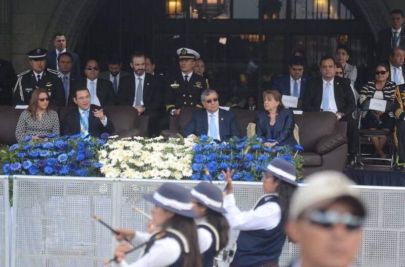 Los líderes de la administración pública permanecieron sobre una tarima al frente del Palacio Nacional de la Cultura, en la zona 1, por donde desfilaron estudiantes y miembros del Ejército de Guatemala.
