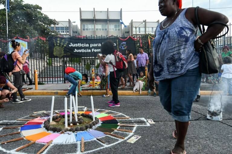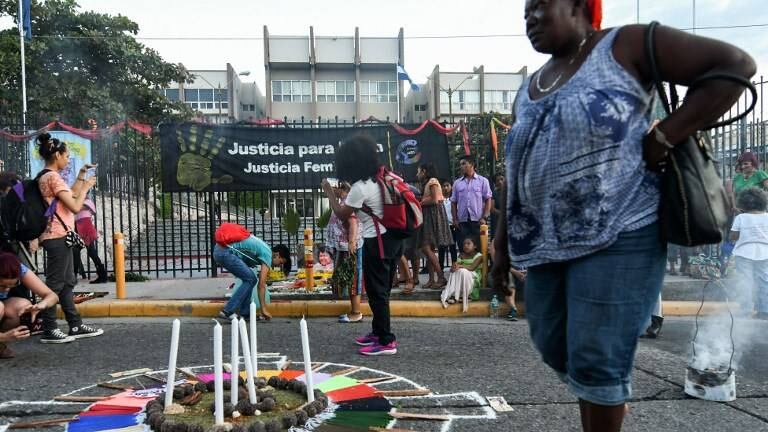 Al ritmo de tambores y maracas, unas 200 personas se concentraron frente al edificio de la Corte Suprema de Justicia (CSJ), sur de Tegucigalpa, donde instalaron frente al portón un altar con velas encendidas y la fotografía de la llamada "guardiana de los ríos", en medio de cánticos en lenguaje garífuna y quemando incienso.
