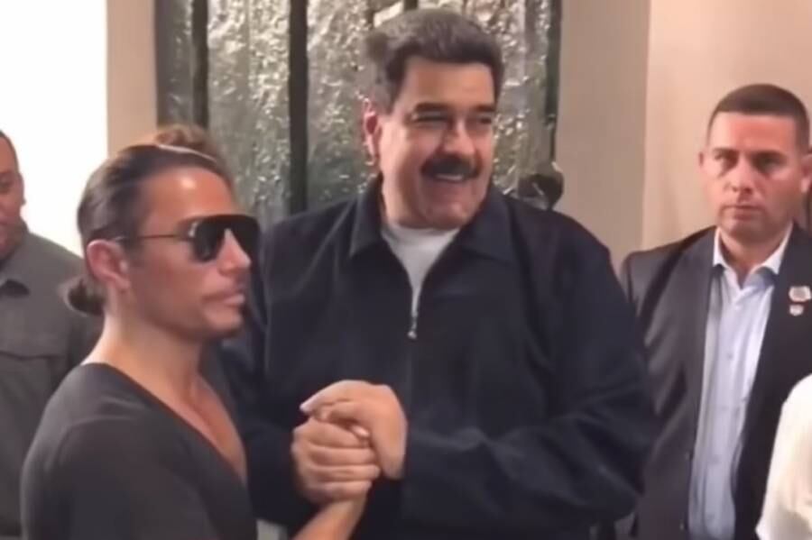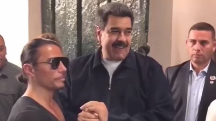En otro video en el restaurante, Maduro fuma un habano sacado de una caja con su nombre en una placa dorada, y recibe una camiseta con la imagen del chef.