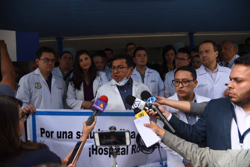 Luis Chávez, de la unidad de Patología, leyó un comunicado en el que la Asamblea del Cuerpo Médico activo de médicos residentes y profesionales de salud del hospital Roosevelt expresó que en ningún momento se ha dejado de atender a los pacientes que requieren atención de urgencia, a quienes están hospitalizados o enfermos crónicos.
