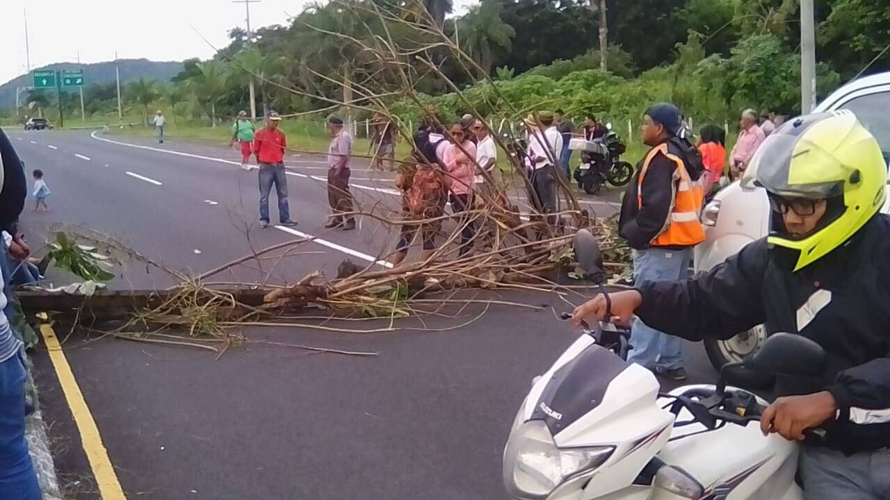 Con ramas de árboles, los manifestantes bloquearon completamente el paso en ambos sentidos de la vía, lo cual ha generado largas filas de vehículos en el área.