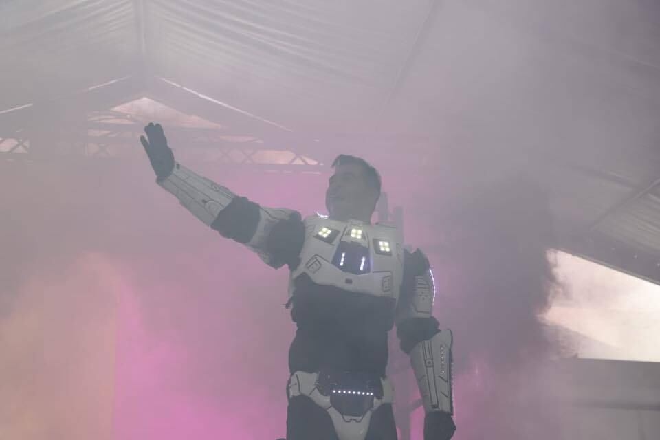 El alcalde de Mixco, Neto Bran, nuevamente sorprendió a los mixqueños al plantarse en un escenario con un disfraz de un robot llamado "Android Master", para luego brindar regalos a los niños.