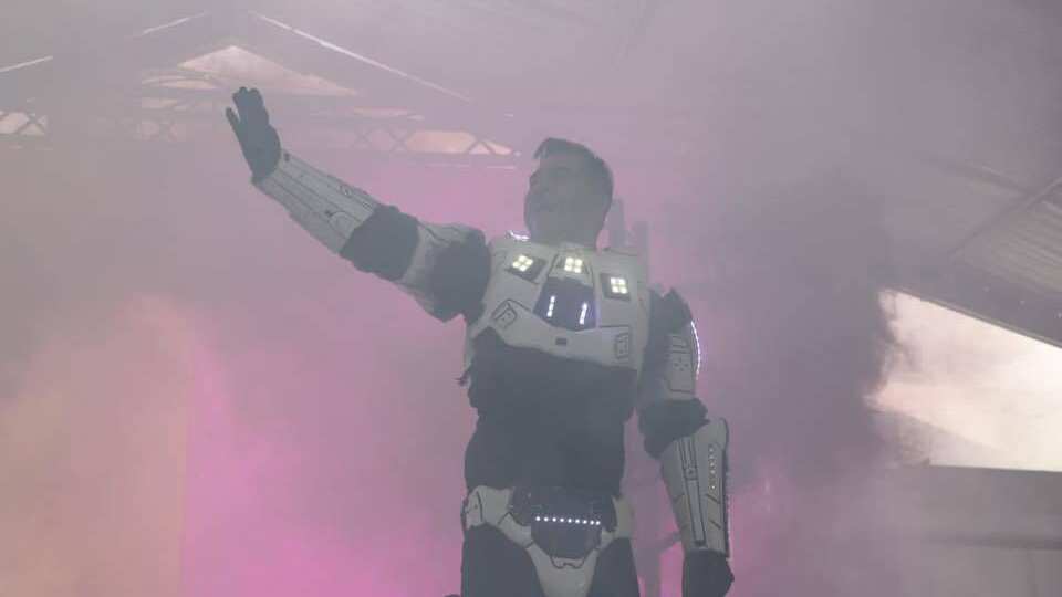 Acompañado de bengalas, un excéntrico disfraz de robot color blanco y emulando los movimientos de un androide, Bran hizo su ingreso a la tarima que contaba con una pantalla llena de colores.