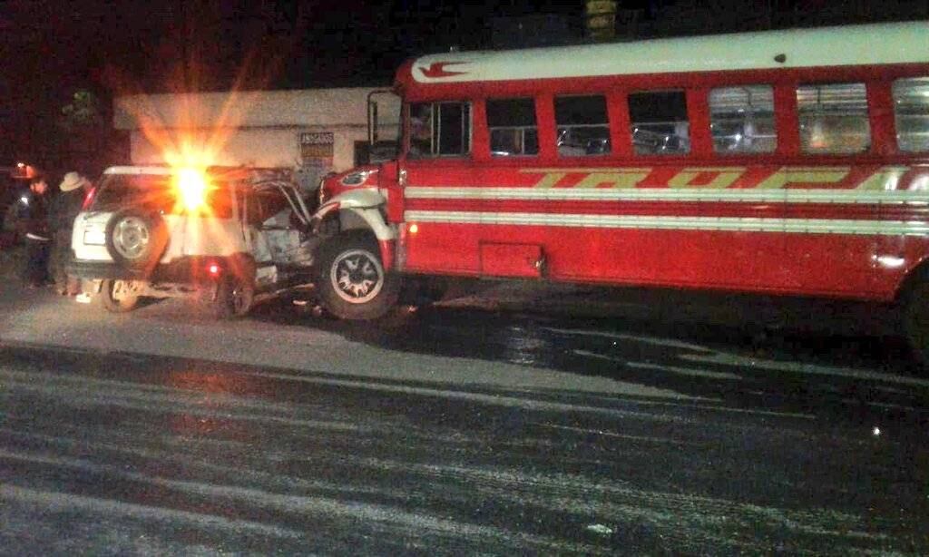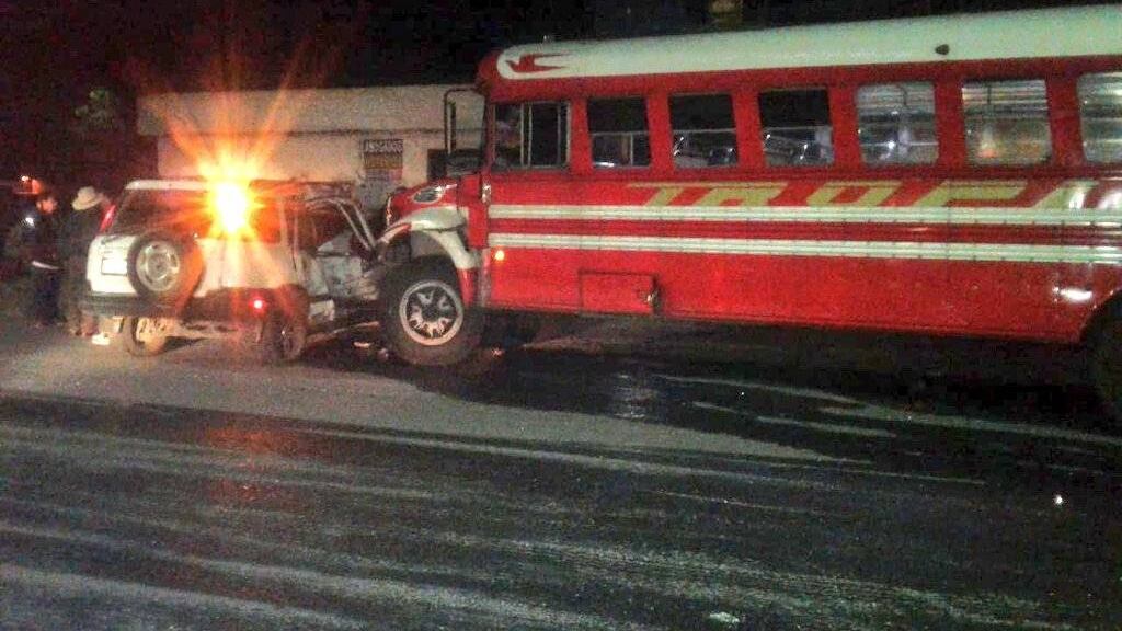 La Policía Municipal de Tránsito (PMT) de Villa Nueva informó que en el kilómetro 13.5 chocaron un autobús de transporte extraurbano y un vehículo particular.