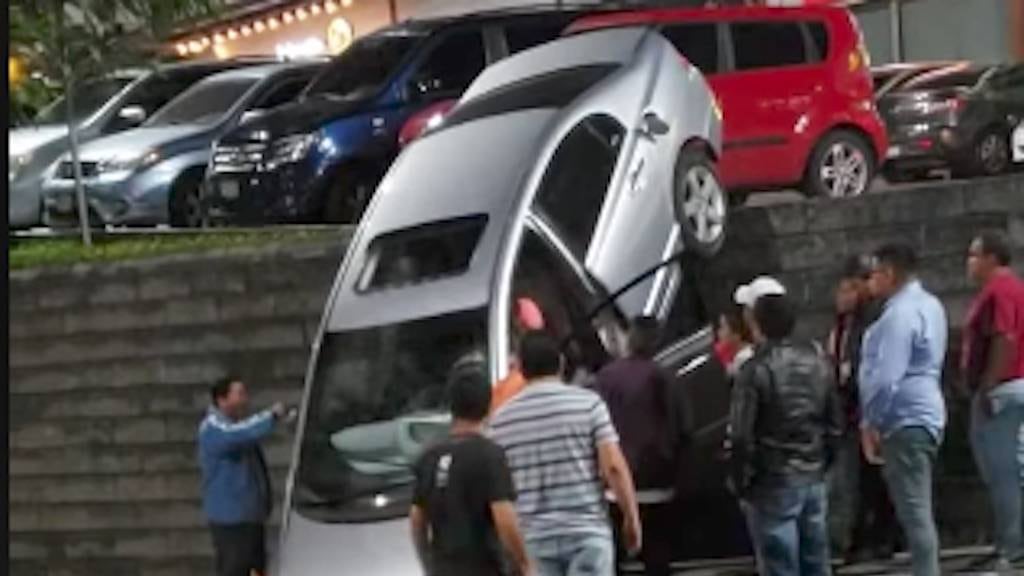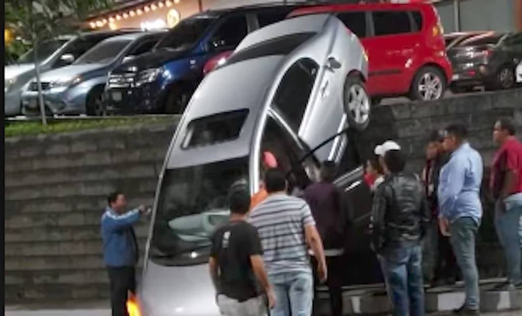 En un video que dura 28 segundos se observa cómo quedó un vehículo tipo sedán luego de haber protagonizado un accidente en el interior del parqueo de un centro comercial ubicado en la zona 17 de la capital.