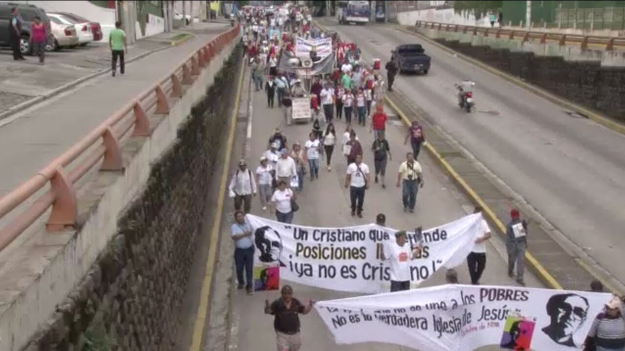 Los manifestantes marcharon este miércoles hasta los tribunales de justicia para exigir que se agilice la investigación del asesinato de monseñor Óscar Arnulfo Romero, quien será canonizado por el Papa Francisco el próximo 14 de octubre.