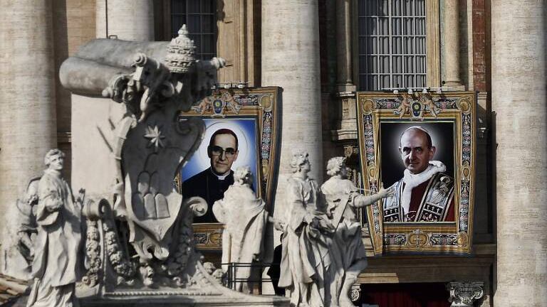 En una multitudinaria misa de canonización celebrada este domingo en la plaza de San Pedro, del Vaticano, el papa Francisco proclamó santos al arzobispo salvadoreño Óscar Romero, emblema de una Iglesia comprometida con los pobres, y al papa italiano Pablo VI, el pontífice del diálogo.