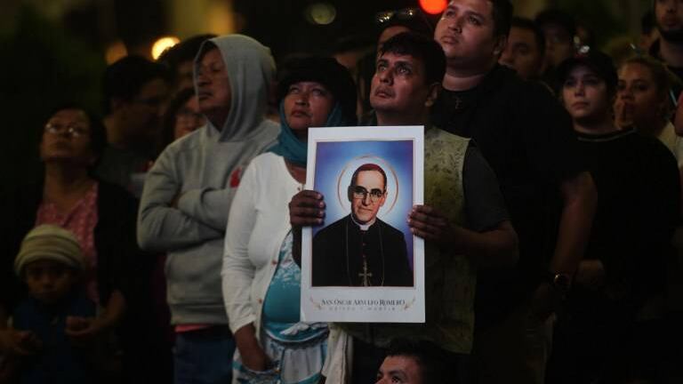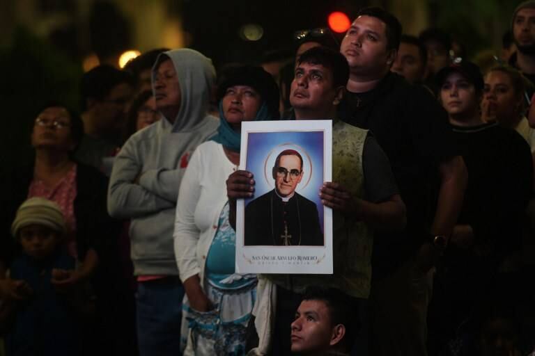 Frente a la catedral de San Salvador, peregrinos que observaban por medio de pantallas gigantes la ceremonia en el Vaticano, estallaron en un prolongado aplauso, abrazos y llantos de alegría cuando el papa Francisco declaró santo al arzobispo Óscar Arnulfo Romero, el párroco recordado como la "voz de los sin voz", asesinado por una bala en 1980.