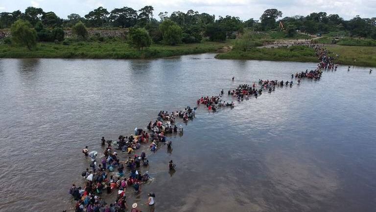 Los salvadoreños, siguiendo los pasos de miles de hondureños que recorren el sur de México, cruzaron a pie el río entre Tecún Umán, en Guatemala, y Ciudad Hidalgo, México, al rechazar el ofrecimiento de asilo o retorno que les plantearon las autoridades mexicanas.