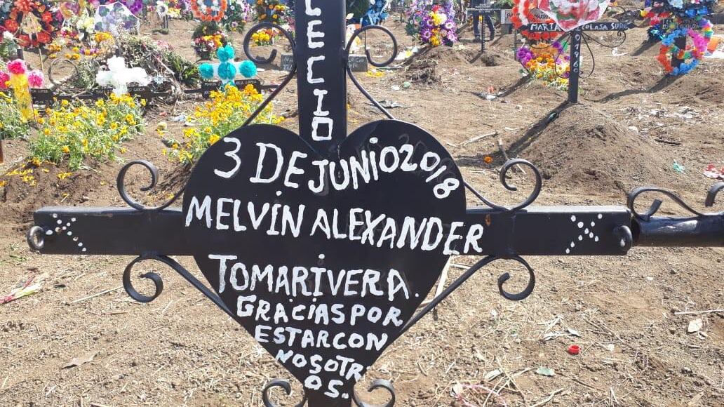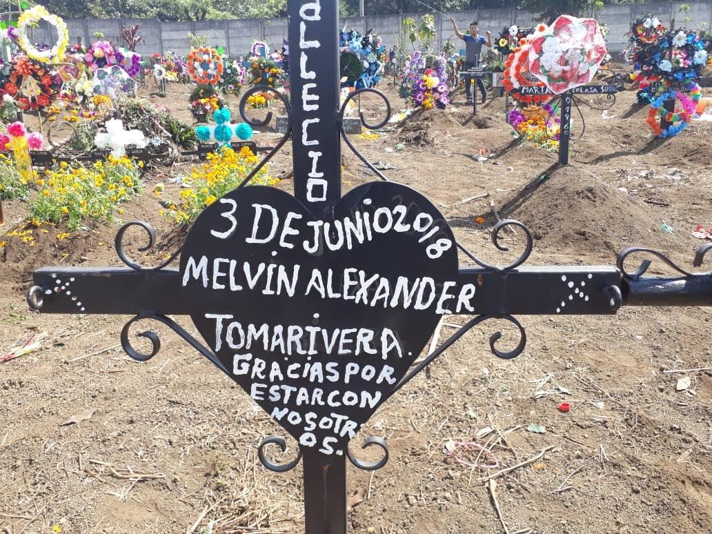 “Falleció el 3 de junio de 2018 Melvin Alexander Toma Rivera, gracias por estar con nosotros”, se leen en una cruz del cementerio de Alotenango.