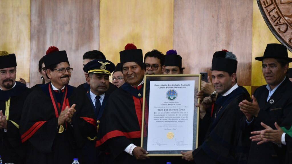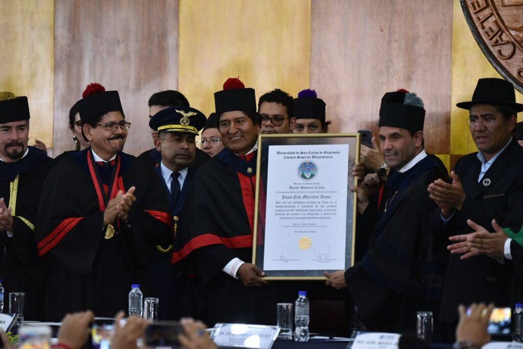 Morales fue homenajeado por las autoridades de dicha casa de estudios por "su enorme aporte a la justicia", señaló el rector, Murphy Paiz, al entregar un Doctorado Honoris Causa al presidente boliviano.