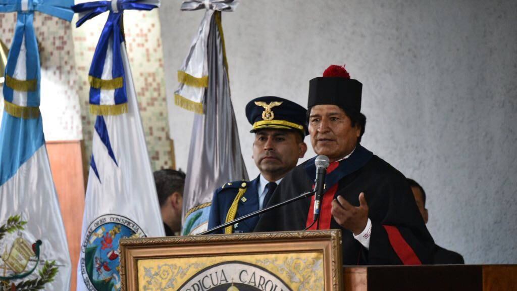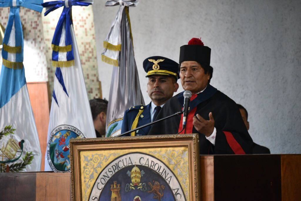 El mandatario Morales fue homenajeado por las autoridades de dicha casa de estudios por "su enorme aporte a la justicia", señaló el rector, Murphy Paiz, al entregar un Doctorado Honoris Causa al presidente boliviano.