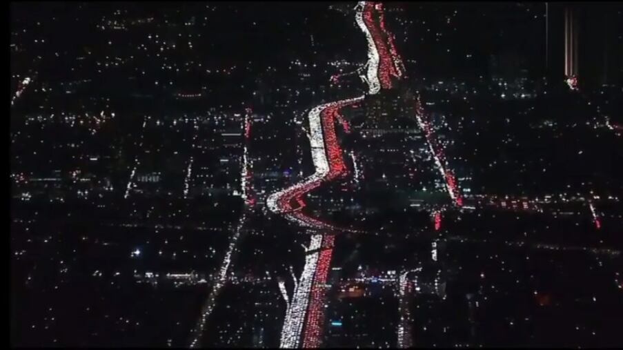 Una de estas postales fue captada por un helicóptero de KCAL/KCBS y retransmitida por CNN, la cual muestra la carretera interestatal 405 totalmente abarrotada en ambas direcciones.