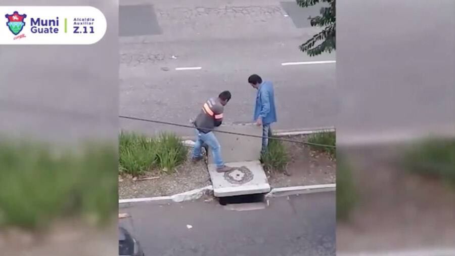 En el material audiovisual se puede observar a dos hombres sosteniendo una de las enormes y pesadas tapaderas de concreto de los tragantes, mientras que otro se encuentra sacando del fondo a un perrito que se había caído en ese desagüe.