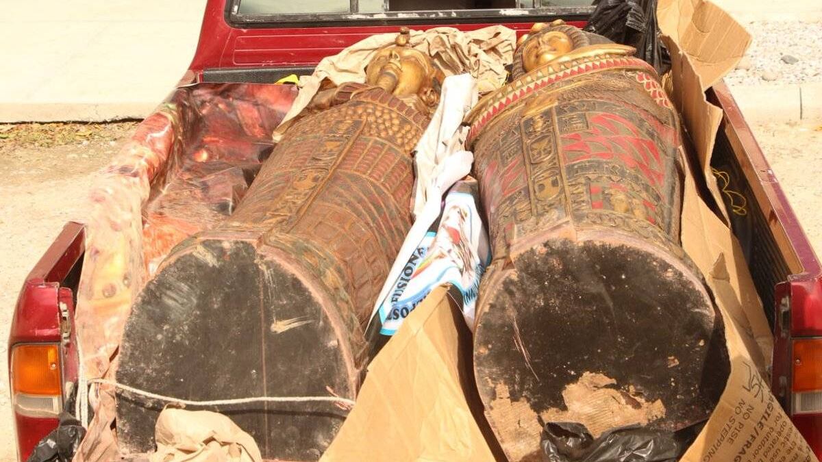 Se trata de Daniel Cac Siquic, de 43 años, y Edwin Manfredo Chávez Pérez de 30, quienes a bordo de un vehículo tipo picop de color corinto y con placas P-773BGD, trasladaban dos estatuas con figuras egipcias.