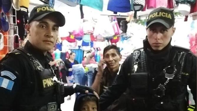 En la imagen aparecen los agentes junto con el pequeño, cerca de la venta donde le compraron un par de tenis.