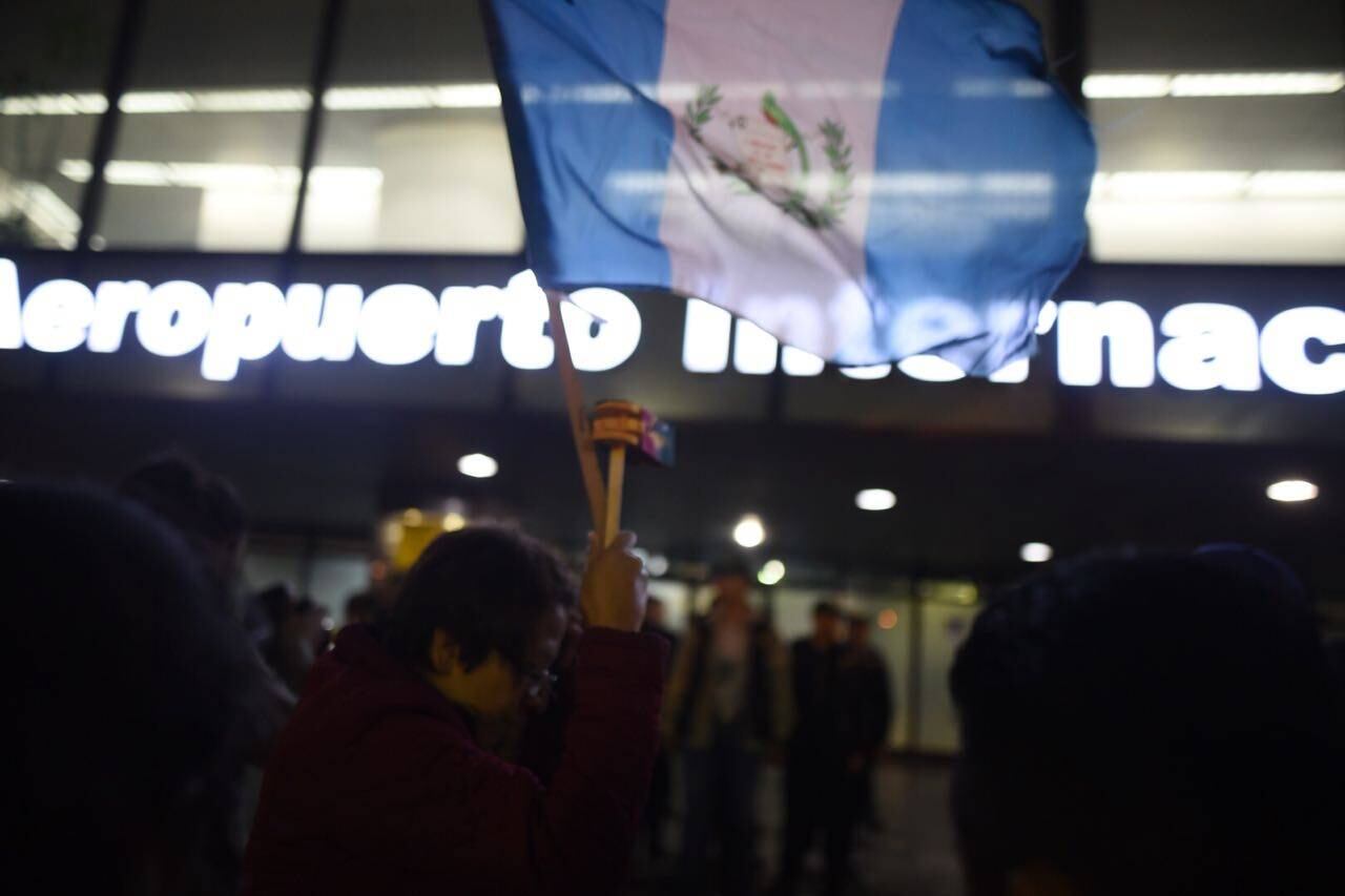 Portando banderas de Guatemala y pancartas, los guatemaltecos, algunos integrantes de organizaciones estudiantiles y sociales, se instalaron en la entrada principal al aeropuerto.
